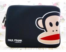 A Macbook Air 13" laptop computer (silver) in a black fabric bag (Paul Frank Monkey image)
