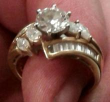 A gold ring with a large diamond in the middle and another four baguette diamonds