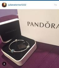 Pandora bracelet with a December birthstone charm and a paw charm the bracelet is a bangle