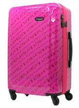 Pink hardcover suitcase. Playboy brand. Rollers on the bottom. Contents are mostly clothing.