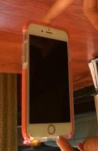 iPhone 6S in a clear with pink peach case (with picture of a dog on a lock screen).