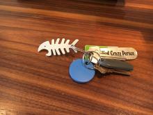 The keys have a metal key ring with 'Certified crazy person' written on it. There is a a blue round chipolo key ring along with fish shaped bottle opener, two gold keys and a silver key. There is also a grey work access fob on them.