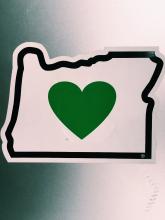 Macbook Pro, GREY, with a Oregon sticker on it, the sticker has a GREEN heart on it.