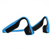 Blue bone tech aftershock Bluetooth head phones in a black bag case with tie dye ear plugs inside