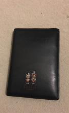 Dark navy blue passport case with name D**** L**** on immunisation history inside cover and yellow fever vaccination book. Left at airport before flight to London. Arrived at airport 5am and flew out at 8am so lost in between these times.