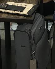 Small, blue/gray carry-on luggage, with cathay pacific green tag "Yiqiao Lau"