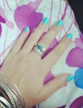 Heavy silver ring with turquoise stone. Has leaves and flowers out of silver and ring around is split at seam