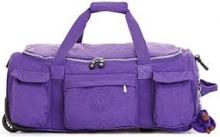Purple rolling kipling suitcase, carry on size filled with clothes and shoes and makeup. Has pink make up bags and a pair of nike sneakers and a pair of platform sandals packed on top of folded clothes and two linen dresses from Mexico.