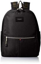 Black backpack, of the brand STATE, it has a silver MacBook laptop inside and a charger for it.