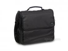 Black ResMed Bag (maybe half the size of a normal backpack, with a black carrying strap, no wheels, and zipper to open), with a CPAP machine in it (two grey blastic boxes (one with a screen), white tube, and black charging cord).