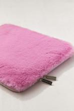 A pink fuzzy IPad case with an iPad and a book inside. On top of the case, there is a blue neck pillow. Left on the sitting area on terminal 5 Gate 30 around 12:30 pm on Thursday June 22.