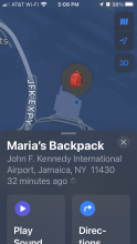 a 5x7 whit case with pink initial M with on phone accessories inside and a tracker. Tracker shows still at JFK airport.