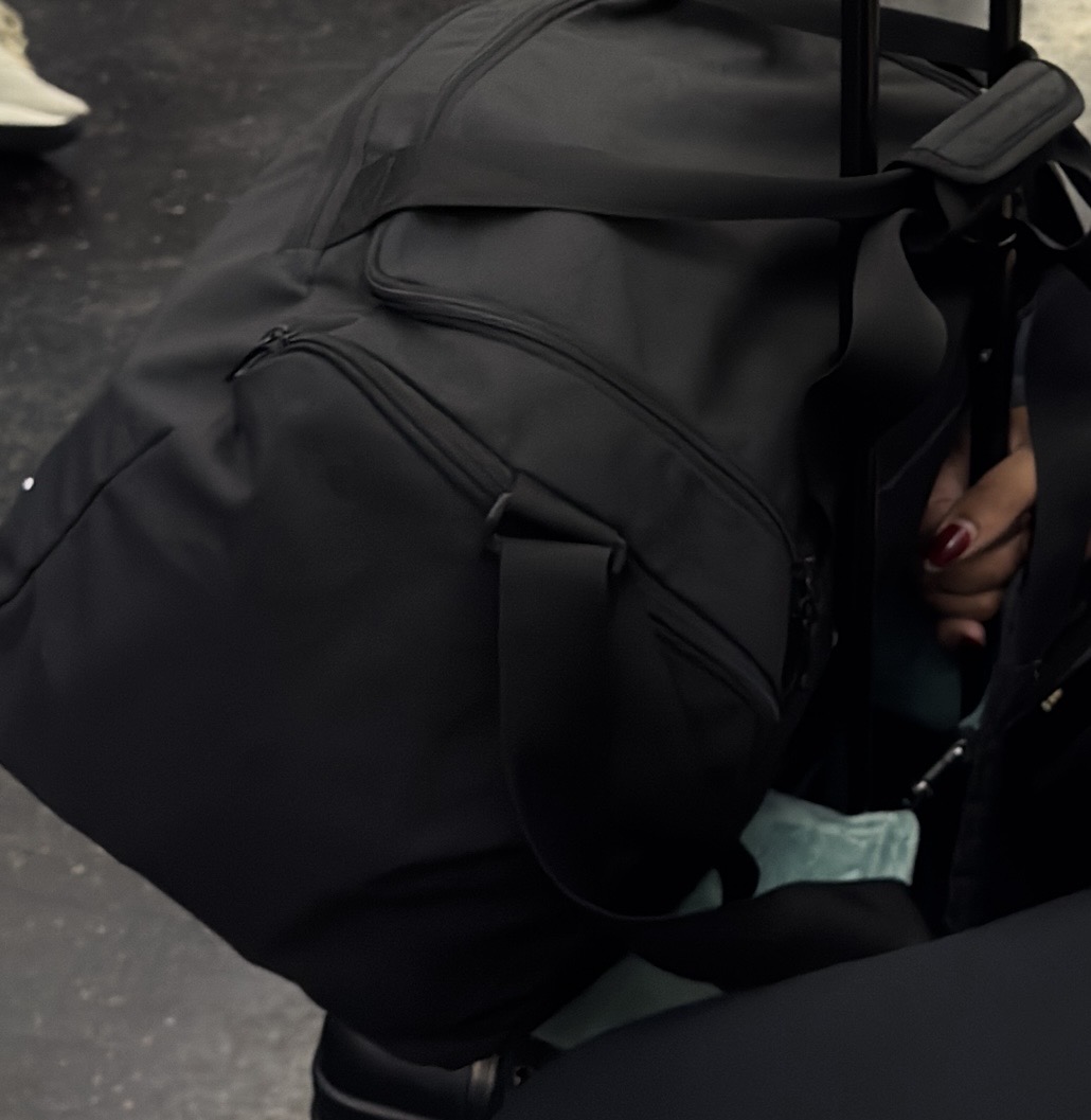 Black bag with white Puma brand on one side. Contains candy, caps, child’s blanket and a grey plush elephant toy. The bag was lost between 2:30-4:30pm. Probably We left on flight LK411 to Munich.