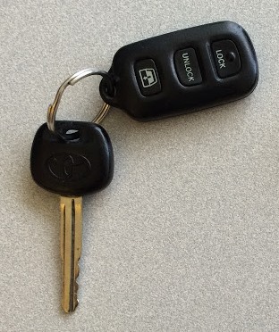 Toyota car key. Single key with black fob. Fob has 3 buttons on the front and 1 red on the back.