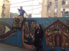 Big black scarf with color(red,blue,green and gold) in the middle. Very important item because its a family item with great emotional value. Plus a beanie with fluorescent yellow color and writing "hype". Only the scarf- piece of cloth is important .Textile is smooth and in the picture the guy on the wall is having the scarf open , It looks like a mandala when its open. With strings of cloth around the 2 sides