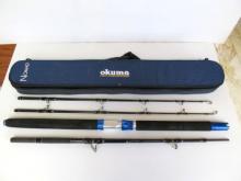 Okuma Nomad Travel Fishing Rod, in a small, lender blue travel bag with the label "Okuma Nomad" on it. One of the rod pieces is broken.