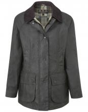 Dark Sage Green Waxed Jacket with green and tan lining, shortbread, and books in a Barbour Bag.