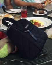 Black quilted carry bag with handle and zipper from storksak. Contains baby food, a bib (blue with green dots and a green A), baby fork and spoon, a set of colored pencils, drawing booklets