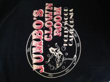 Black hooded sweatshirt with a "Jumbo's Clown Room Hollywood California" graphic on back. There is also a smaller graphic on the front left of the chest area.