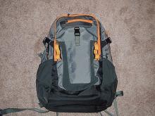 grey and orange patagonia backpack. inside is a laptop, charger, and schoolwork (textbooks, etc...)