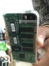 Calyn's cell phone. Carrier case is decorated with electronic circuit boards. Model is iPhone SE.