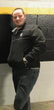 Black synthetic jacket. Inside of neck collar is black-and-white stripes. Front\breast of jacket has 2 horizontal white stripes.