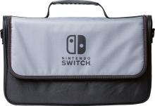 Left a Nintendo case with a Nintendo Switch inside. It is a blank and grey shoulder bag with the word Nintendo across the front. Inside is a second case with a Nintendo Switch with two yellow controllers. The Game has a piece of tape with the name "Mugleston" on it. There is also a plastic container with a number of games inside.