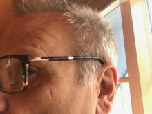 Black vinyl triangular eyeglass case marked "Lensabl" containing a pair of Mont Blanc mens eyeglasses (black with gold trim) and a pair of cheaters with bamboo wings