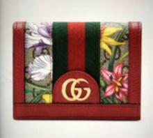 Metallic Gucci shopping bag with wallet inside. The wallet has flowers on it.