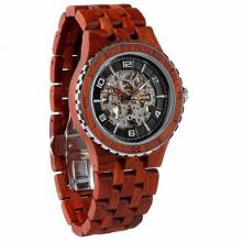 wood wrist watch, brown and black with black face and visible movement. picture up loaded is very similar.
