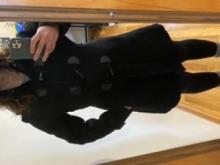 Black wool blend toggle pea coat. Womens size large. Pockets should be empty. I think it was left on a bench across from TSA checkpoint item retrieval at Terminal 4 (arrived on international flight and had to clear Customs to connect) around 2pm.