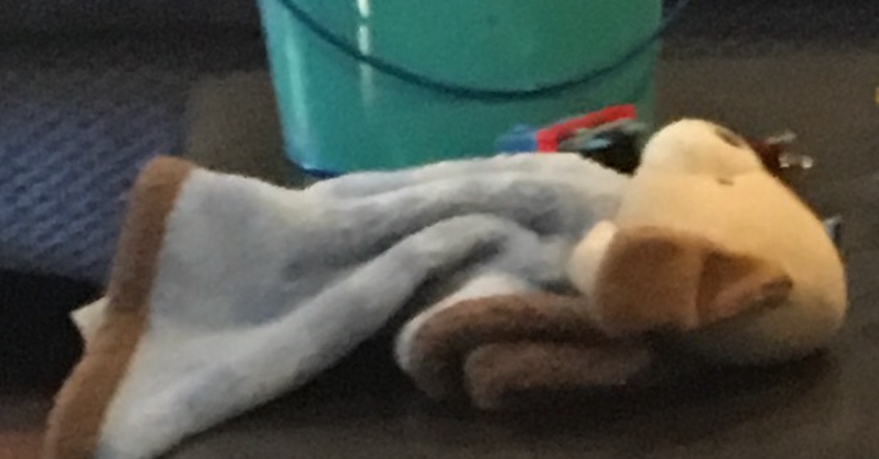 Soft small child’s dog headed blanket. It’s a baby’s item. Blue with some beige trim pieces. We were on BA 113 that arrived into term 7 about 8pm august 18th. Our child is devastated at the loss of this little “doggy”.
